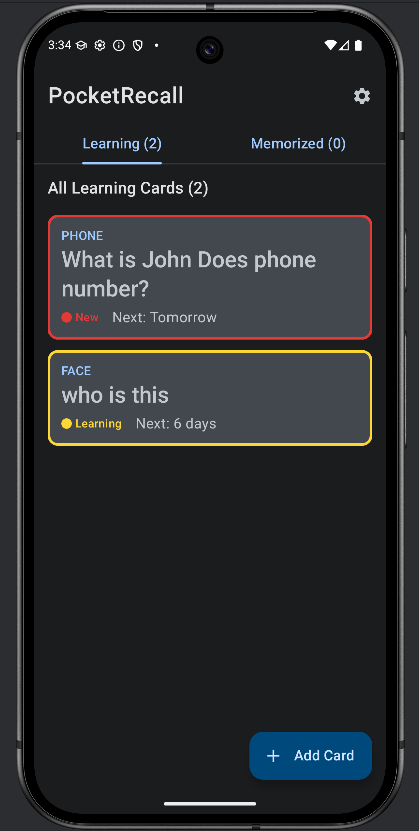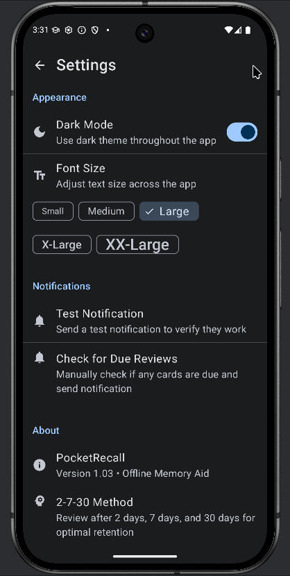 PocketRecall uses a simple **2-7-30 spaced repetition method**: after learning, you review again in 2 days, then 7 days, then 30 days. This timing helps reinforce memory before it fades, so you spend less time studying and keep more of what matters.